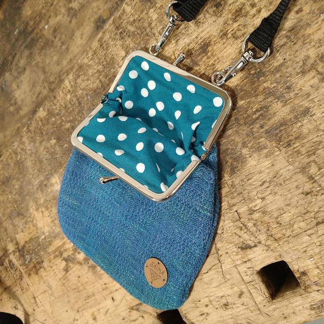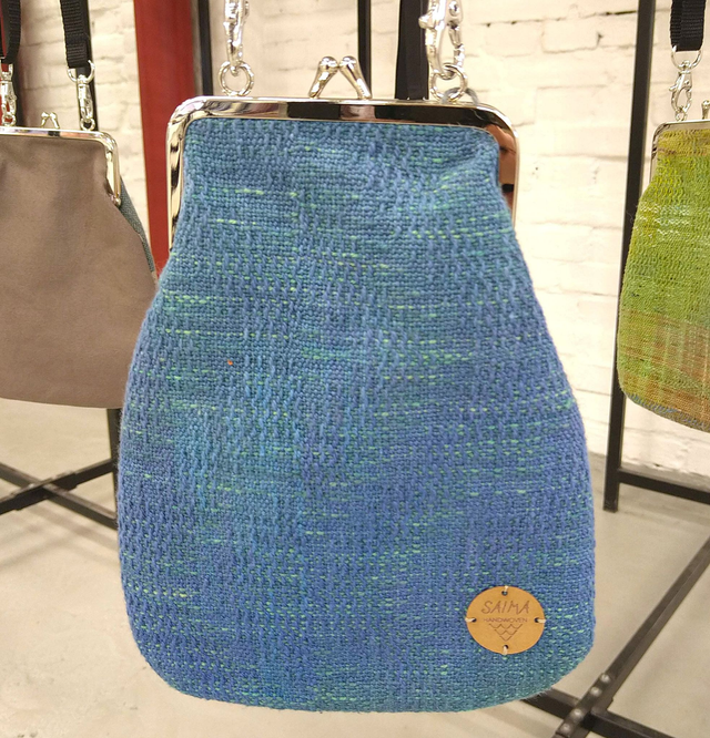 Laukku on valmistettu käsinvärjätystä ja -kudotusta kantoliinakankaasta. Jokaisessa laukussa on yksilölliset värit ja materiaalit. Laukussa on 15 mm leveä irroitettava musta nylonhihna. Hihnan saa säädettyä noin pituuksiin 85-165 cm. Tuotteen voi pestä käsin viileässä vedessä. Kuivaa muotoon kuositeltuna. Ei saa liottaa.